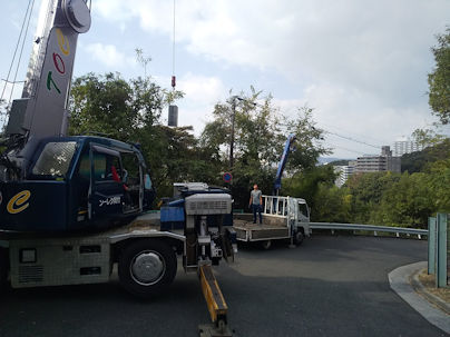施工したときもレッカー車を使用しており、このたびもレッカー車での解体、搬出作業でした。